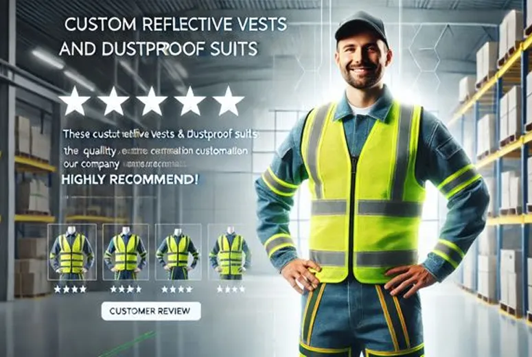 Here is a visually appealing image of a customer review featuring reflective vests and dustproof suits. Let me know if you’d like further edits or adjustments!